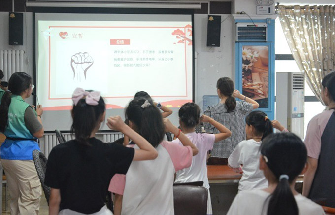 图为志愿者带着小朋友们进行庄严宣誓 张智坤 供图