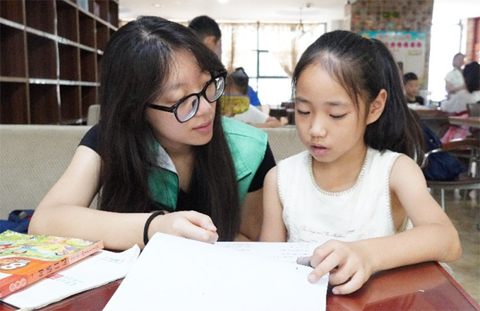 图为志愿者给小朋友辅导作业张智坤供图