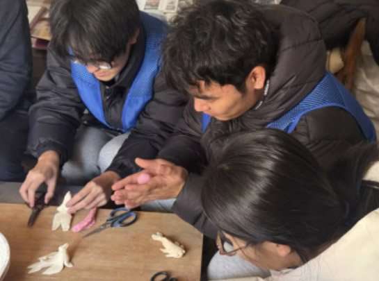 活动伊始,传承人和结合自身经验,从面塑的历史渊源、原料筛选、和面配比三个方面展开讲解,重点演示了捏、剪、刻、粘等核心技法。团队成员围坐一旁,认真记录技法要点,亲手参与实操练习,针对塑形力度把控、传统颜料调配、色彩搭配逻辑等疑问向传承人虚心请教,传承人逐一解答并分享了“精益求精、慢工出细活”的匠心心得。传承人还讲述了面塑背后驱邪祈福的民俗文化寓意,让团队成员深刻领略了非遗技艺中的文化底蕴与人文精神。