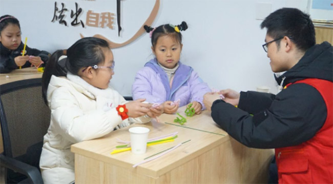 (孩子们用扭扭棒制作“管道小卫士”形象)