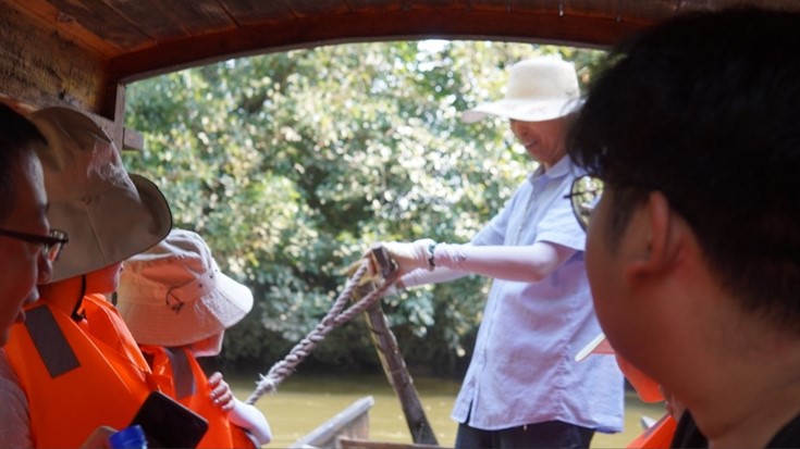 7月28日上午,调研团来到彭村新天地。从磨盘山湿地公园入口进入,泛一叶轻舟,在丁广运河上行向曲径通幽处。河道两边树林阴翳,水面平静无纹。中途,广德市新天地农旅发展有限公司旅游部王文主任上船向团队成员讲解丁广运河。运河位于磨盘山,至于为何得此山名,王文主任解释道,其实磨盘山并非山,而是一片岛,这与当地人口语有关。上世纪50年代有一个政策叫“谁开荒谁耕种”,村民习惯将“到开荒过的土地去”称为“上山去”,以前村民大多种植桃树,故也称为桃山。