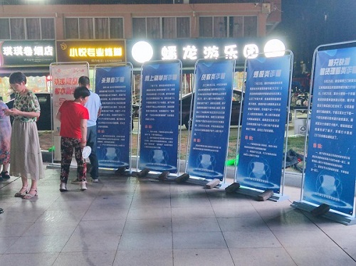 实践服务团在夜晚跟随海游派出所民警来到人流量较大的蟠龙公园进行反诈防骗宣传。与普通宣传不同的是,此次活动我们为参与活动的居民们免费提供带有反诈骗知识的特色草糊冻,让人们在享用美食的同时也能进一步了解到更多的反诈知识。居民们都很乐意参加此次活动,在活动之后为实践团竖起大拇指。