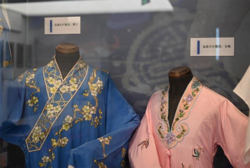 昆曲服饰在延续明代风格的基础上,又融合了清代的服饰特色,以红白蓝黄黑紫粉等颜色为主色调。传统的昆曲服饰把刺绣和盘扣元素运用得淋漓尽致,所描绘出来的图案不追求艳丽,而是雅致。在搭配服饰时讲究整体,服装上的图案也会和扇子、手帕等饰品相呼应,所以昆曲的服饰也被称为“穿在演员身上的布景”。
