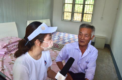(图为团队成员采访康复中心志愿服务组副组长郑学海 徐康健摄)