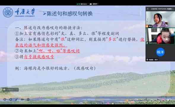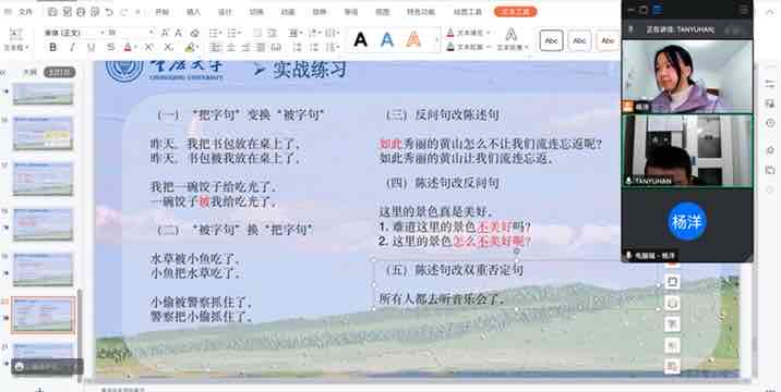 2023年1月14日,重庆大学志愿者杨洋参与了“一起云支教”线上志愿活动,她根据三年级小朋友自身学习的弱项,精心准备了“句式转换”的语文课程,课程内容主要分为句式改写前测、技巧训练、后测三个部分,小朋友与志愿者讲师积极互动,课堂氛围活跃。