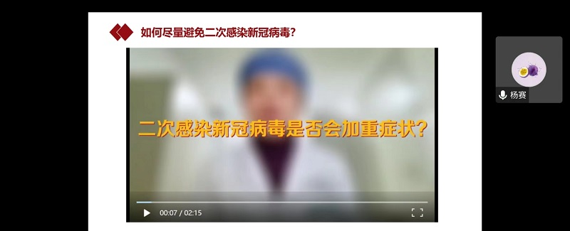 习总书记在党的二十大报告中强调,要“推进健康中国建设”,“把保障人民健康放在优先发展的战略位置,完善人民健康促进政策”。结合当前疫情形势,为全面贯彻党的二十大提出的健康中国建设要求,进一步提高社区居民的健康保健意识,帮助大家树立健康的生活理念,营造健康文明和谐的社区氛围,2月6日上午,山东大学文学院“研心永炙”防疫知识宣讲团采用线上会议的形式,为青岛市莱西市经济开发区刘家院西社区的广大居民带来了一场关于“健康知识科普”的宣讲活动。