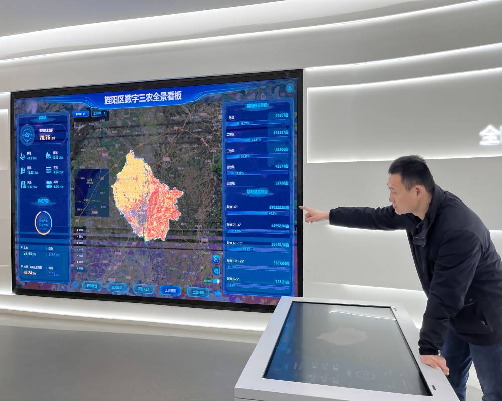 随后,负责人田熹远带领逐梦小队前往数字农业综合馆,观看“数字农业智引旌阳,实现农业现代化”的宣传片,了解园区大概的总体情况、规划布局以及产业发展;同时,逐梦小队也参观了全区域资源管理图展厅,由负责人田熹远讲解该园区以构建1个数字底座,实施3大功能版块和N个应用管理系统为旌阳数字农业管理模式,运用卫星遥感和人工智能技术,对全区所有农业用地进行可视化编码,构建数字农业“智慧大脑”。