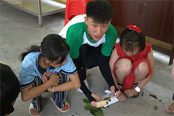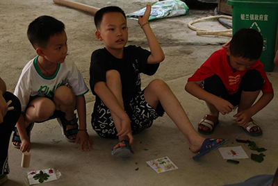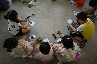 7月4日,湖南科技大学土木工程学院暑期三下乡社会实践志愿服务团支教组在湖南省洞口县毓兰镇山阳村开展支教活动,带领山阳村的孩子们体验非物质文化遗产——植物拓染,提高孩子们对中华传统文化的认同感,用一朵花、一片叶、一块布、一把锤,就可以留下植物的自然形状与色彩。