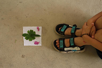 小朋友们在白布上将植物摆成自己心仪的图案。邓茗柯 摄