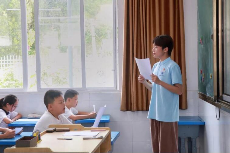 而在歌曲教学环节,志愿者张仁睿通过让孩子们去帮助“开心超人”的方式,激发孩子们去学唱歌曲的兴趣与热情。志愿者仔细教学,台上的小老师教一句,台下的同学唱一句。在这个过程中,明显感觉到在一次次教学当中,同学们的积极性越来越高,声音越来越自信。