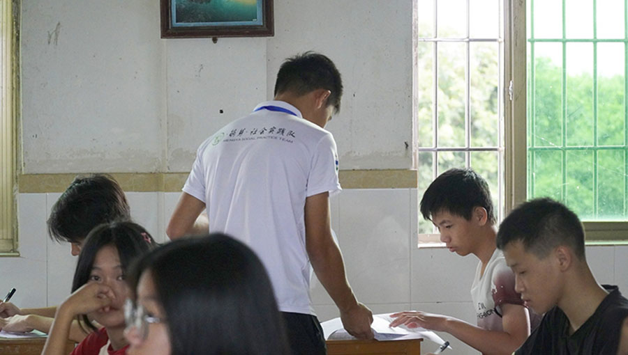 7月4日至5日,在吴川上杭中学,发生了一场生动别致的“角色转换”体验。来自岭南师范学院“萌芽”社会实践队的四十余名大学生,在开展教学活动之前,帮助该校完成了期末监考工作,帮助当地的中学生完成期末考试,同时也让这群大学生们感受到了乡村教育的不同风貌,他们分别负责监考、批改试卷、辅导复习等工作,由上杭中学校长杨荣忠和”萌芽”实践队队长戴宙钰共同指导完成。