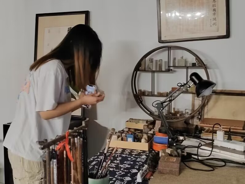 通过“非遗+民宿”的结合,秀文斋第七代传承人董国华将家族文化在新时代传承出新模样,走出一条“以商养文,以文助商”的发展之路。如今,客栈还被董国华当作大本营,通过展示非遗产品、开展非遗活动进行非遗宣传,汇聚了许多国内外的篆刻爱好者。不仅如此,为了让更多人有机会了解篆刻,董国华在日照职业技术学院开设了篆刻课堂,举办了十几场公益培训和展览,为篆刻爱好者启蒙、鉴赏提供平台。就这样,董记刻字一刀一刀把日照的历史刻进了另一个浑然一统的世界。历史的脚步从远处踏来,留有鲜红的印记,跳动着每一个时代的脉搏。