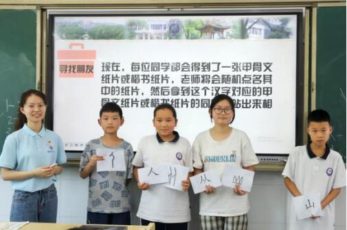 课堂的结尾,志愿者简雯通过让同学们分别去扮演同一字的甲骨文或楷书,组织孩子们进行了一次特别的“找朋友”游戏。孩子们在这个过程中不仅巩固了知识,也增进了友谊。