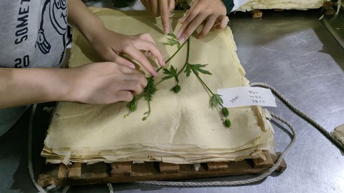 接着,采集后的原材料先进行植物的吸水纸压片操作,用标本专用吸水纸和压片夹对植株进行固定,在压片过程中,陈老师提醒团队成员注意将叶片完全舒展并将少量叶片进行翻面便于后期观察叶片的背部特征,期间,团队成员分工协作,动手尝试,在体验的同时也收获了快乐,部分成员的的压片结果受到老师和队员的一致好评。