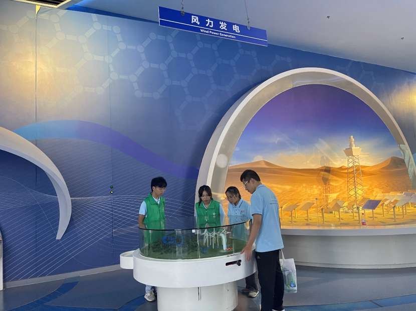 (图为实践团队成员观看风力发电模型)