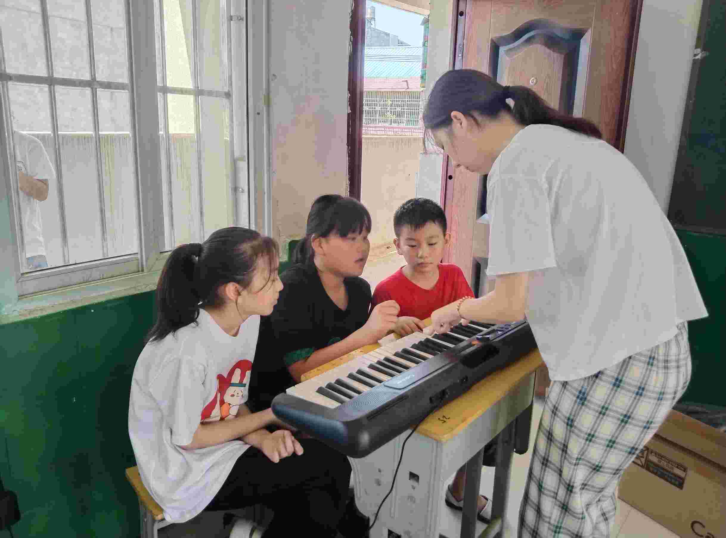 电子琴课上,老师在教孩子们如何准确找到对应的音符,一对一辅导弹奏简单、基本的曲目。