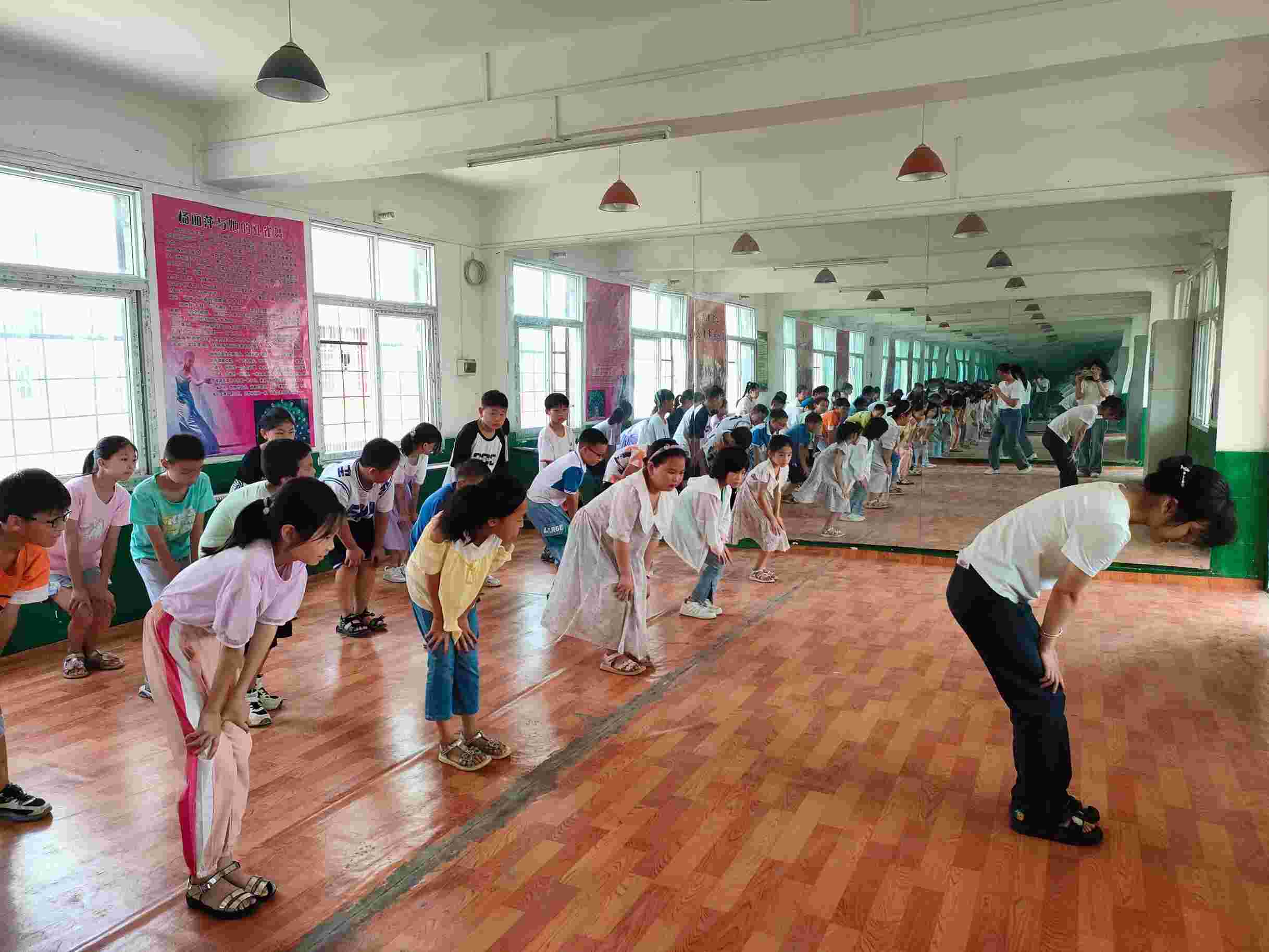 图为健美操课上课之前,老师带领孩子们进行课前的准备活动,舒展筋骨,防止运动的过程中受伤。