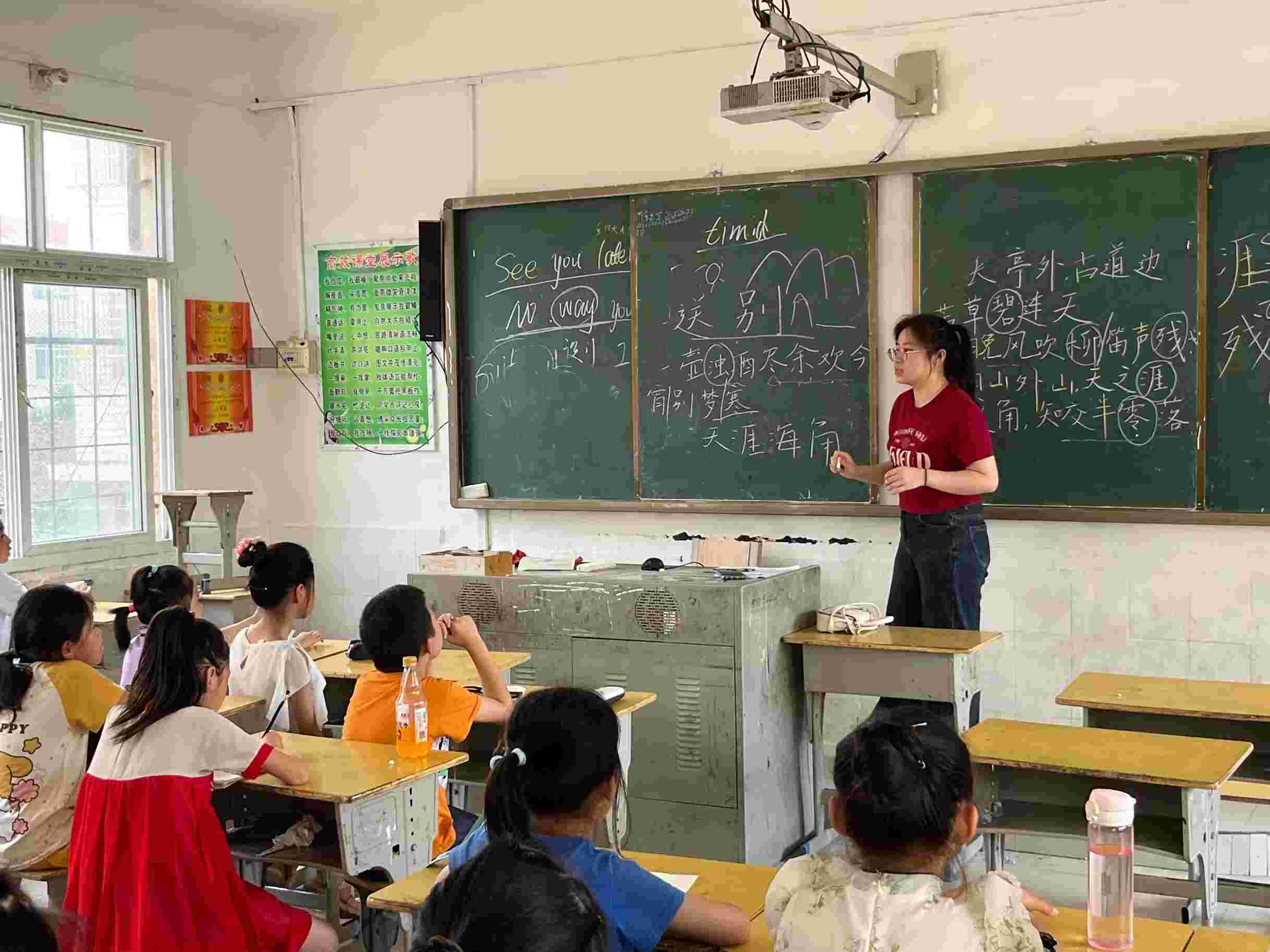 图为语文课上,老师为孩子们讲解古诗,带领孩子们体会古人的思想感情,陶冶情操。