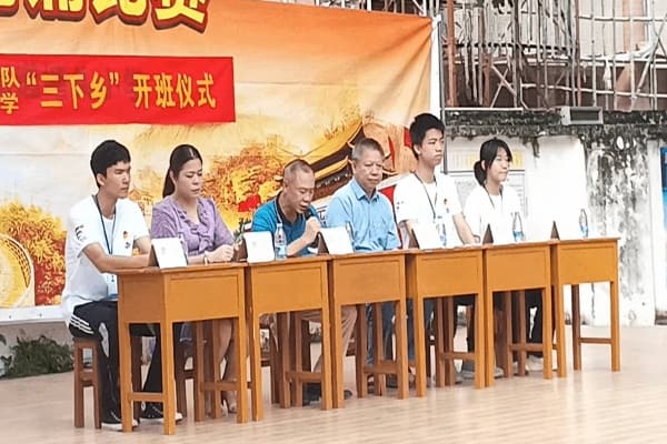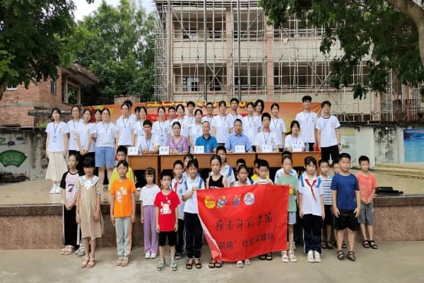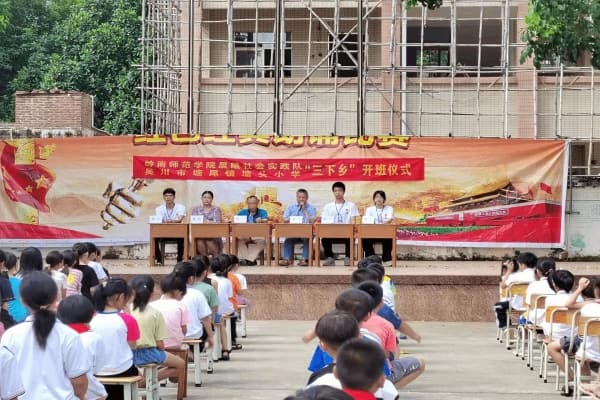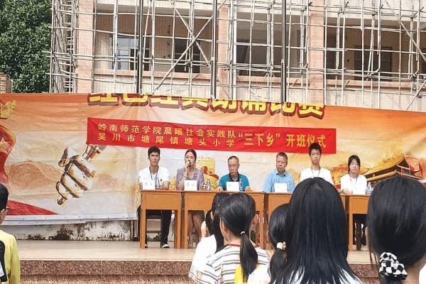2023年7月10日上午8:30,岭南师范学院数学与统计学院的“晨曦”社会实践队在吴川市塘头村塘头小学举行开班仪式。特邀塘头村村长凌东旭、塘头小学校长凌舒雯和指导老师欧伯群出席并发表讲话。