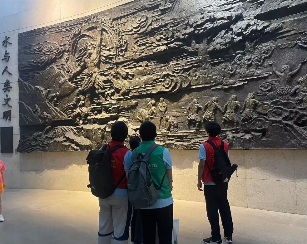 在水与人类文明展区中有六幅巨幅铜浮雕,分别为“水开鸿蒙”“水主沉浮”“水利万物”“水润天下”“水顺自然”“水佑邦国”,分别阐述了水与文明起源、文明兴衰、物质文明、精神文明、政治文明、生态文明的关系。 队员们不仅为气势恢宏,精美绝伦的巨幅浮雕所震撼,也深刻感受到了水与人类文明之间密不可分的关系。