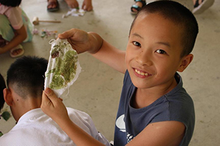 在志愿者老师的指导下,孩子们将植物设计成自己喜欢的图案,用透明胶带固定后,挥动锤子不断进行敲打,随着锤子的上下舞动,植物的汁液逐渐渗入织物之中,伴随着孩子们欢快的笑声,植物的自然色彩、脉络纹理被永远地印存在了布中。