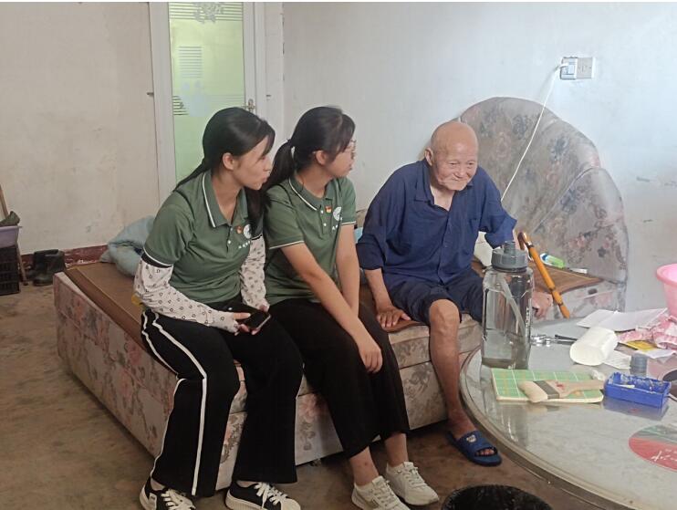 同小朋友们宣讲完关于劳动、法律和环保的相关知识后,实践团成员拿着准备好的两箱牛奶,在村书记的带领下,前往一位九十三岁高龄的老党员家里进行慰问。在看到实践团成员的到来时,老人家很是高兴,一直笑着。