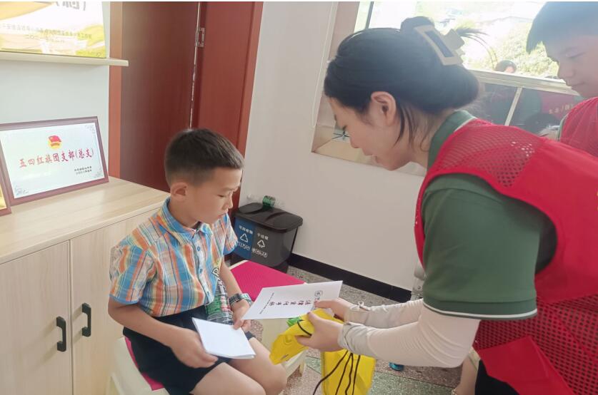 图为社会实践团队成员向社区小朋友发放宣传手册