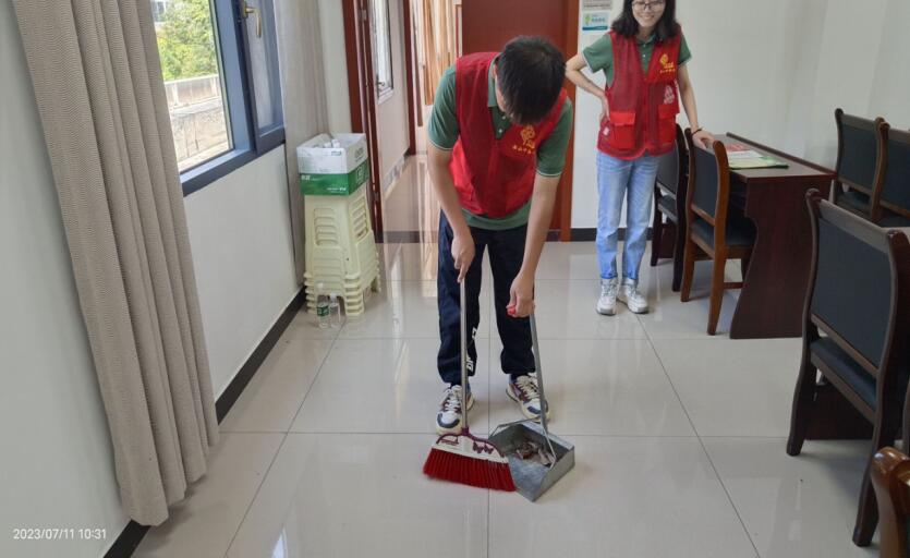 图为社会实践团队成员在帮助社区清扫宣讲会议室