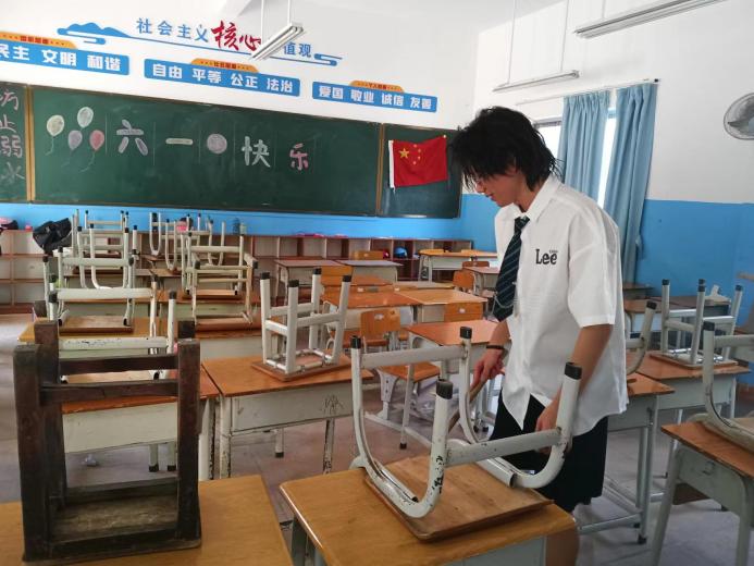 随着学生离校,校园内顷刻间变得寂静无声。然而,这并不意味着工作的结束。实践队员们自觉地走进教室,开始了一项重要任务——打扫整理。