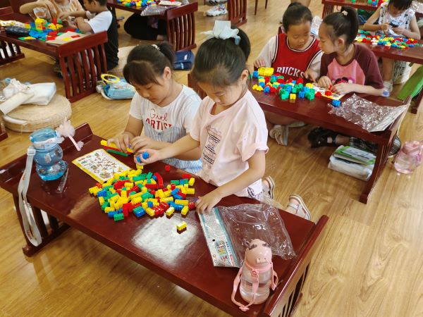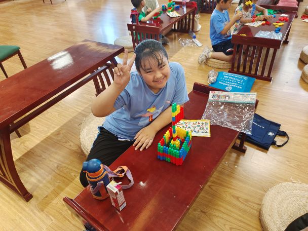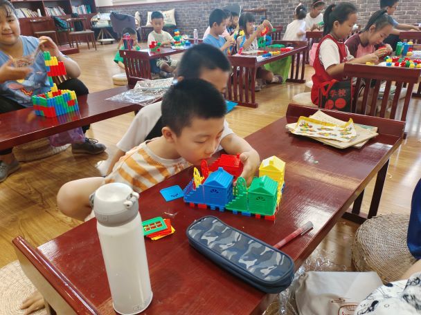 7月11日山东理工大学材料科学与工程学院麦田助教实践团在积家村进行支教。今天早上的第一节课是由胡子凡老师带来的数学积木课。胡子凡老师首先给同学们讲解了不同积木的拼接方法,然后让同学们既可以根据积木的提示图片来进行拼接,也可以自由发挥自己的想象力来拼接积木。