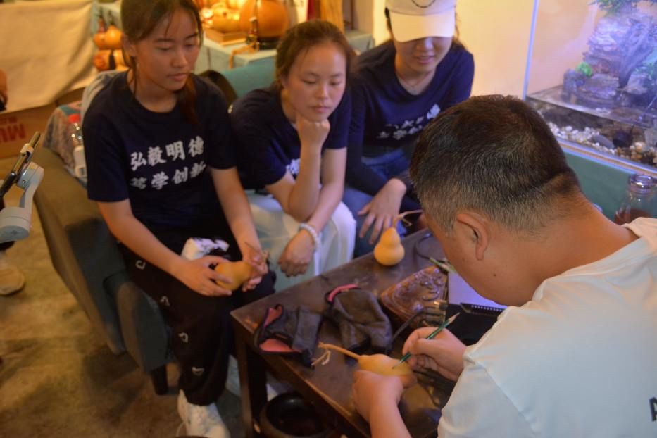 调研完皮影戏后,实践队又来到了当地葫芦坊进行走访调查。葫芦画是一种古老的传统工艺美术品。在葫芦上刻画和装饰的艺术称为“葫艺”。实践团队来到袁家村“葫芦坊”,通过采访葫芦坊老板,队员们了解到在葫芦上赋诗作画、进行艺术创作能表达富贵平安、福寿绵延、多子多福等美好祝愿。实践队员还在师傅的指导下,亲自体验在葫芦上绘画,深深感受到了葫芦画艺术的乐趣。