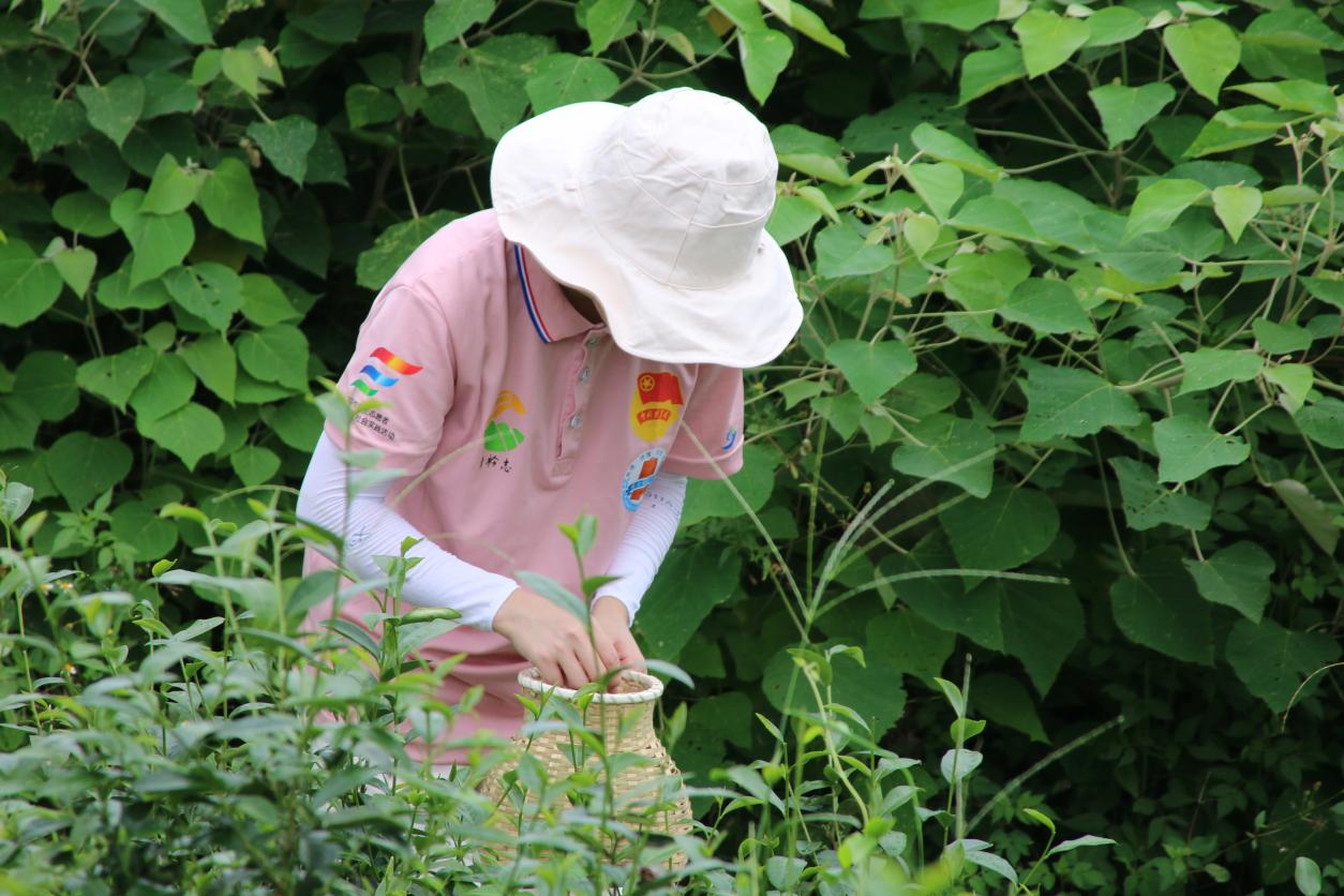 上图为青衿志实践队员杨诗静正在采摘茶叶 唐伟俊 摄