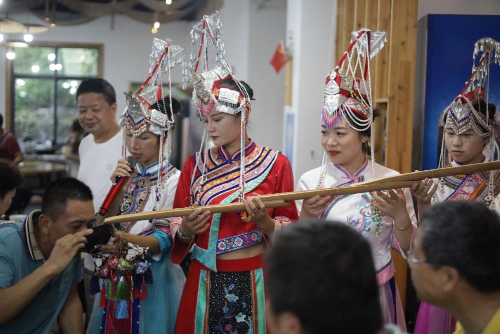 迎宾宴上的高山流水酒仪式,更是给我们留下了深刻的印象。省级非物质文化遗产红曲酒是高山流水的专用酒品,红色酒水裹挟着清甜的酒香从酒坛中流入长竹板的那一刻,我们仿佛听到了山涧的溪流、看到了满山的绿色,感受到了畲族人民对自然的敬畏和对生活的热爱。这是一种让人澎湃的仪式,让我们更加心怀敬意地饮下每一口酒,更加深刻地感受到了畲族文化的深厚底蕴。