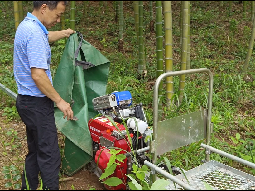 讲至兴头,阮宝根揭开一台机器上的油布,向队员们介绍起它的作用。原来,在机械化之前,竹子都是由村民用自己的肩扛下山,过程又累又慢,又因为山路崎岖,存在着很大的安全隐患。但是在机械化之后,借助履带运输机,也就是被绿油布罩住的这台机器,村民只需要把竹子放在运输机上并将其固定好,竹子就能顺着履带轻松到达山脚,大大提高了生产效率。除了履带运输机,队员们还见到了太阳能灭蚊灯。山中昆虫繁多,有灭蚊灯在,村民的工作环境会更加舒适些。