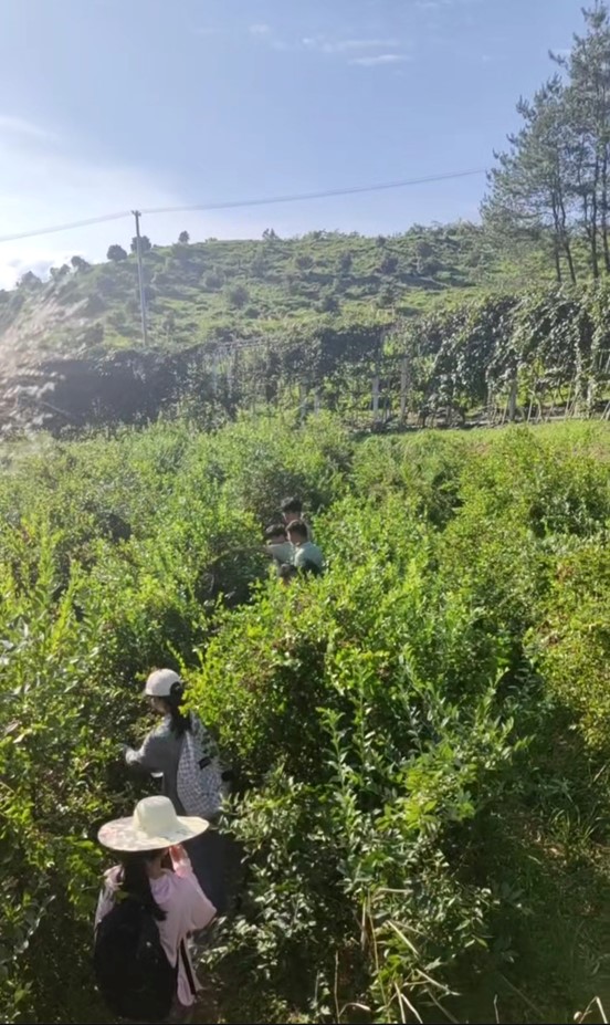 穿越在翻新的水泥路,略过一株株高耸笔直的红木杉,实践团队一行人来到了盘古山庄深处,一处占地400亩的果农农庄。紫红紫红的蓝莓树散落在路旁的斜坡,一溜溜透红泛白的蓝莓在夏天的阳光下十分耀眼。竹子编排覆盖的走廊上披撒着猕猴桃的攀枝,小小毛毛的果实随风飘扬。