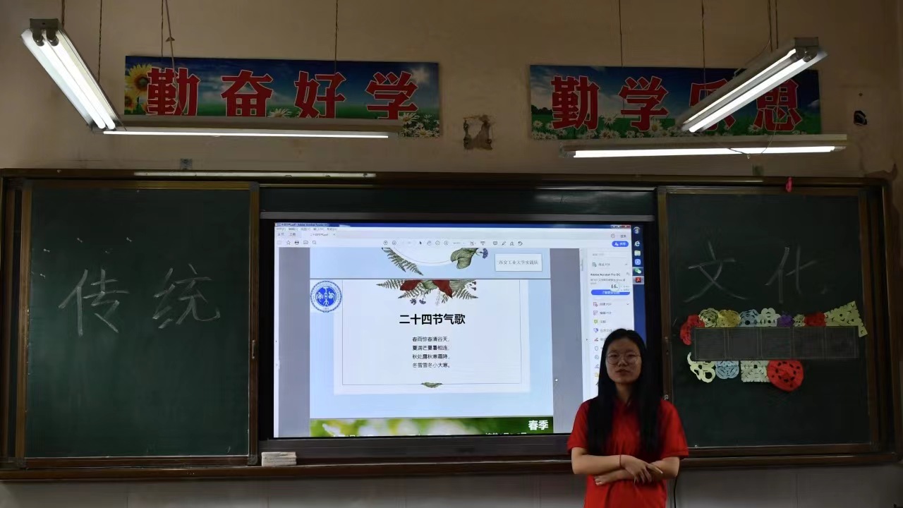 活动中,队员们还向孩子们讲解了二十四节气,二十四节气是中国先民认识和改造自然的重要参照,蕴含着悠久的文化内涵和历史沉淀,是中华民族悠久历史的瑰宝。节气知识普及对树立孩子们对中华民族传统文化的自信心有着重要意义。实践队以二十四节气为题开展主题教育活动,让孩子们更清楚了解到节气的变化对于农时的重要。在活动中,所有孩子们都学会了二十四节气歌,知道了具体的二十四节气分别是什么以及具体时间和对应特点。极大激发了孩子们对学习的热情和对课余知识的向往,为孩子们今后的学习生活提供了良好的开端。