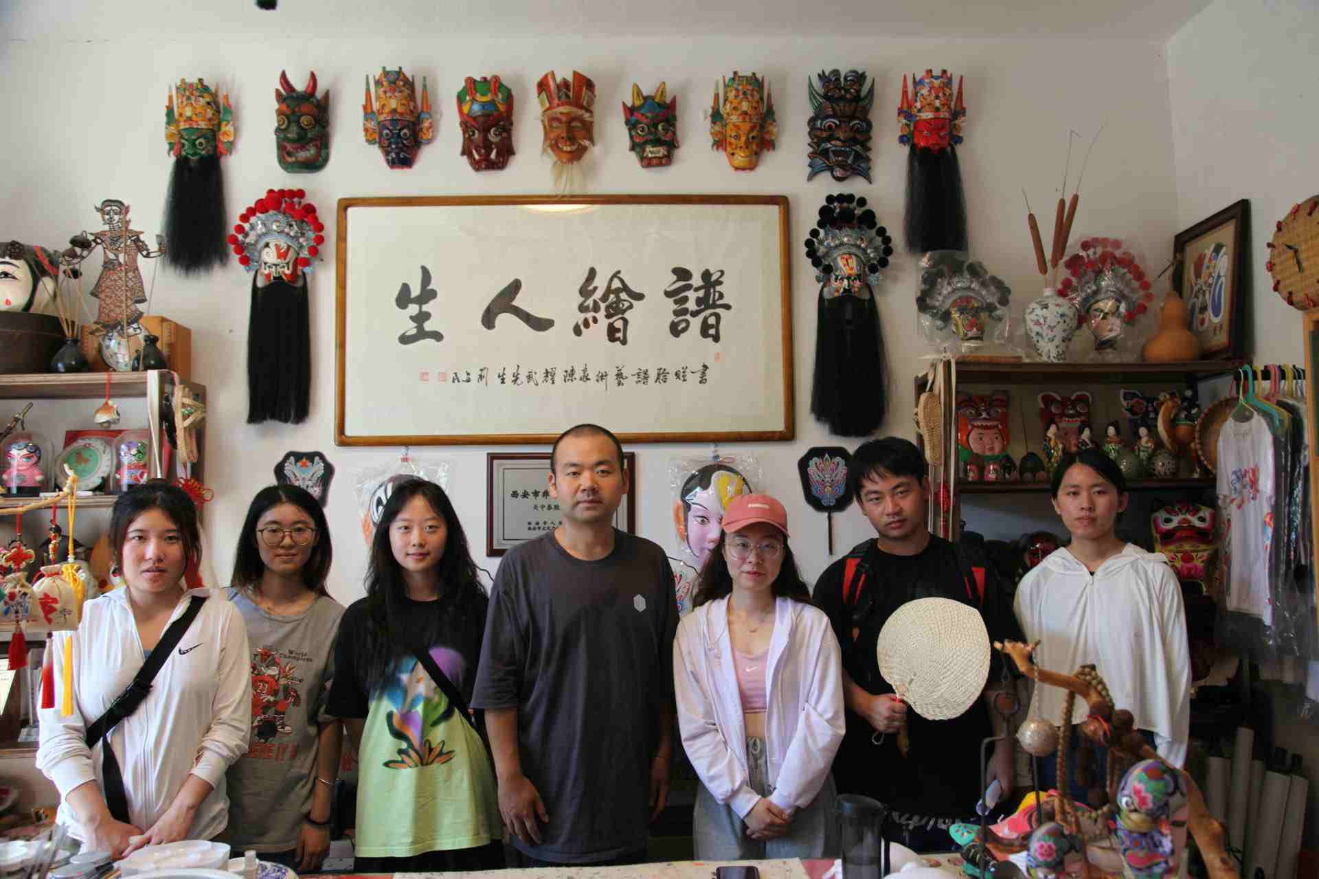 紧接着,调研团成员有幸认识到了“非遗乡集”秦腔戏曲脸谱的传承人陈耀武。作为土生土长的西安人,陈老师与秦腔脸谱的结缘可以追溯到几十年前,在父亲的影响下,苍凉悲壮、激越高亢的唱腔给少年的他留下了深刻的印象,其中色彩绚丽、形象夸张、富于想象力的秦腔脸谱更是让其着迷。陈老师说:“唱秦腔、画脸谱,一学就会,一画就像,我认为自己和秦腔有着天生的缘分。” 在专业剧团工作期间,他发现,种类繁多的秦腔脸谱处于一种无序和随意的状态,一些早期的秦腔脸谱更是处于遗落失散的境地,为此,他四处奔波,几年下来,已经收集到了一千多张秦腔图谱。出于对秦腔脸谱的热爱,他受邀来到小峪口村,结合这里的利好政策与环境,他潜心创作,摸索出了一条创新传承之路,发现了“非遗+”等多种非遗文化传承模式和非遗乡集新业态,让非遗“活”起来的同时,也带动了周边群众增收,这也让陈耀武也看到了非遗发展的未来。