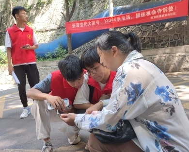 图为团队离开摩天岭小区途中遇到一位阿姨,支付宝被自动扣费,团队人员帮助其关闭自动续费条约。通讯员 刘慧妹 供图。