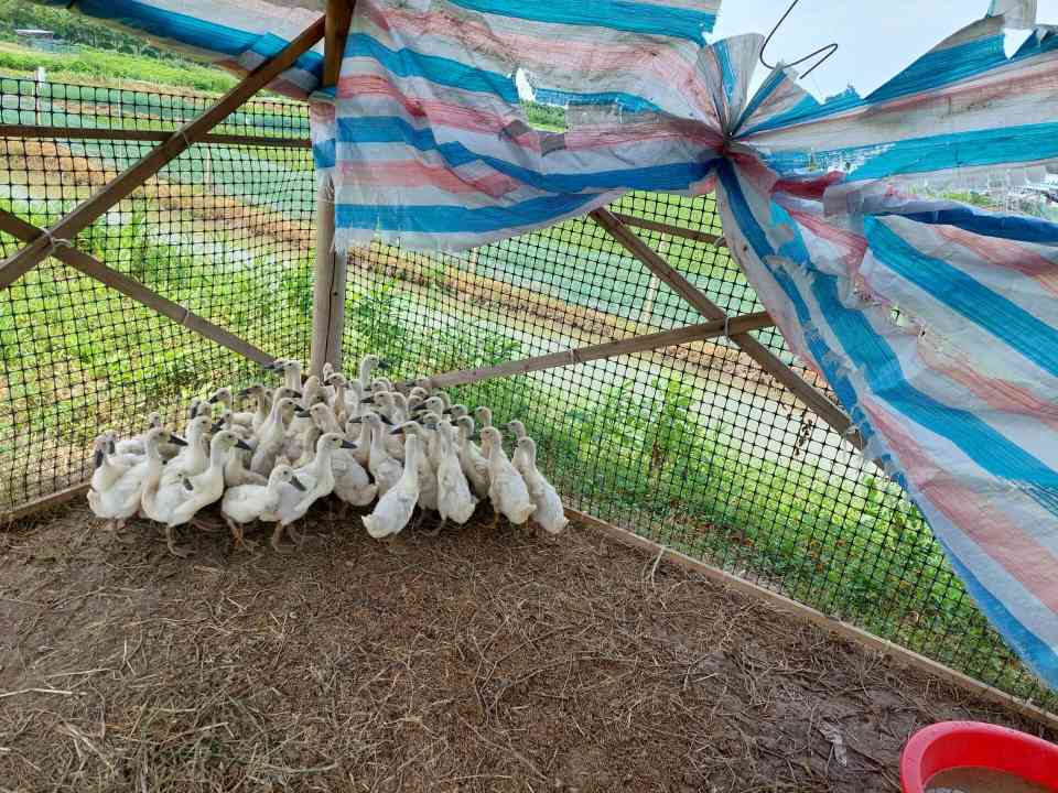 实践团观察到在棚中遮阴的鸭群,胡师兄向我们介绍,这是将要投放到稻-虾-鸭模式小田块中的鸭子,。稻-虾-鸭复合种养模式是在稻虾共作模式基础上试验成功的一种新模式,该模式利用虾、鸭、灯控制水稻病虫草害,减少农药化肥使用量;鸭粪与虾粪排入土壤,使土壤肥力提高;同时提高了稻米品质,增加了鸭虾的收入,是一种效益高、品质优、绿色环保的新型种养模式。正值小龙虾收获时节,而鸭子还没长到能下田除草除虫,需到八月份再放养。