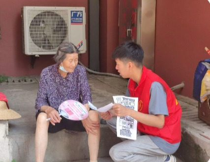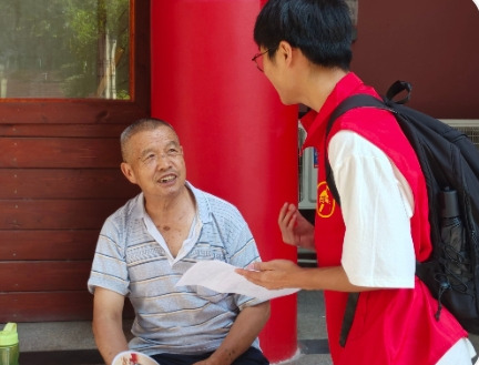 图为团队人员与路边闲坐老人交流沟通,同时为其讲解宣传单上的防诈知识。通讯员 石朗 供图。