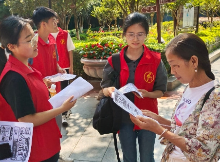 图为团队人员正在人民公园内给路过的行人发防电诈宣传单,尽量提高他们在使用智能手机时的防诈意识。通讯员 刘慧妹 供图。