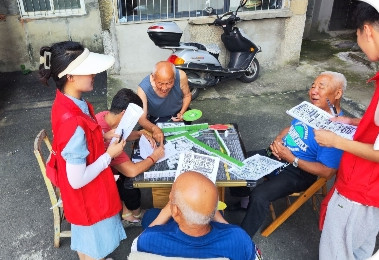 图为袁家沟内,遇到的一群老人正在玩麻将,我们上前沟通交流,正在指导老人进一步完成我们的小问卷,以更好的加强防诈意识。通讯员 王汉阳 供图。