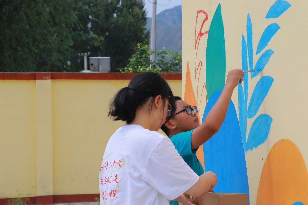 五彩斑斓的墙画终于在课程的最后一日完整地展现在实践队员与孩子们面前。空白墙面一点点被孩子们用画笔绘出形状,用刷子填上色彩。在五天的齐心协力下,队员们与孩子们共同完成了专属于他们的校园墙——这面墙上诉说着队员们与孩子们的初见到熟识,画满了五天的欢声笑语,承载着两代人心心相印的真挚情谊。
