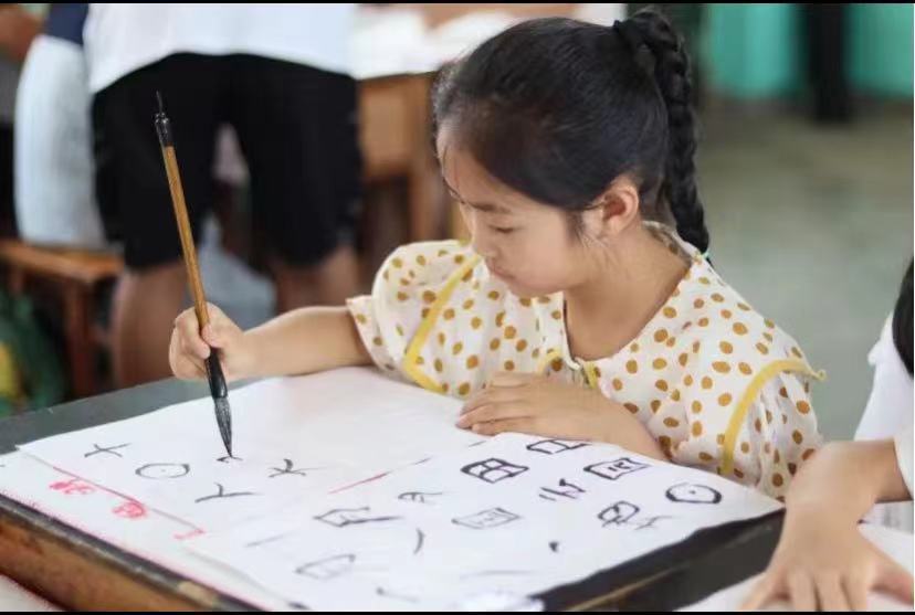 中粮希望小学的孩子们在“书香党建”主题课堂上听电子系的队员们讲述笔墨纸砚,学习毛笔书写的方法。在毛笔教学的过程中,实践队员们着讲述革命先烈欧阳梅生的故事,帮助孩子们在一笔一画中感悟中华儿女的民族气节,在一撇一捺中树立为党和国家建设增砖添瓦的崇高理想。