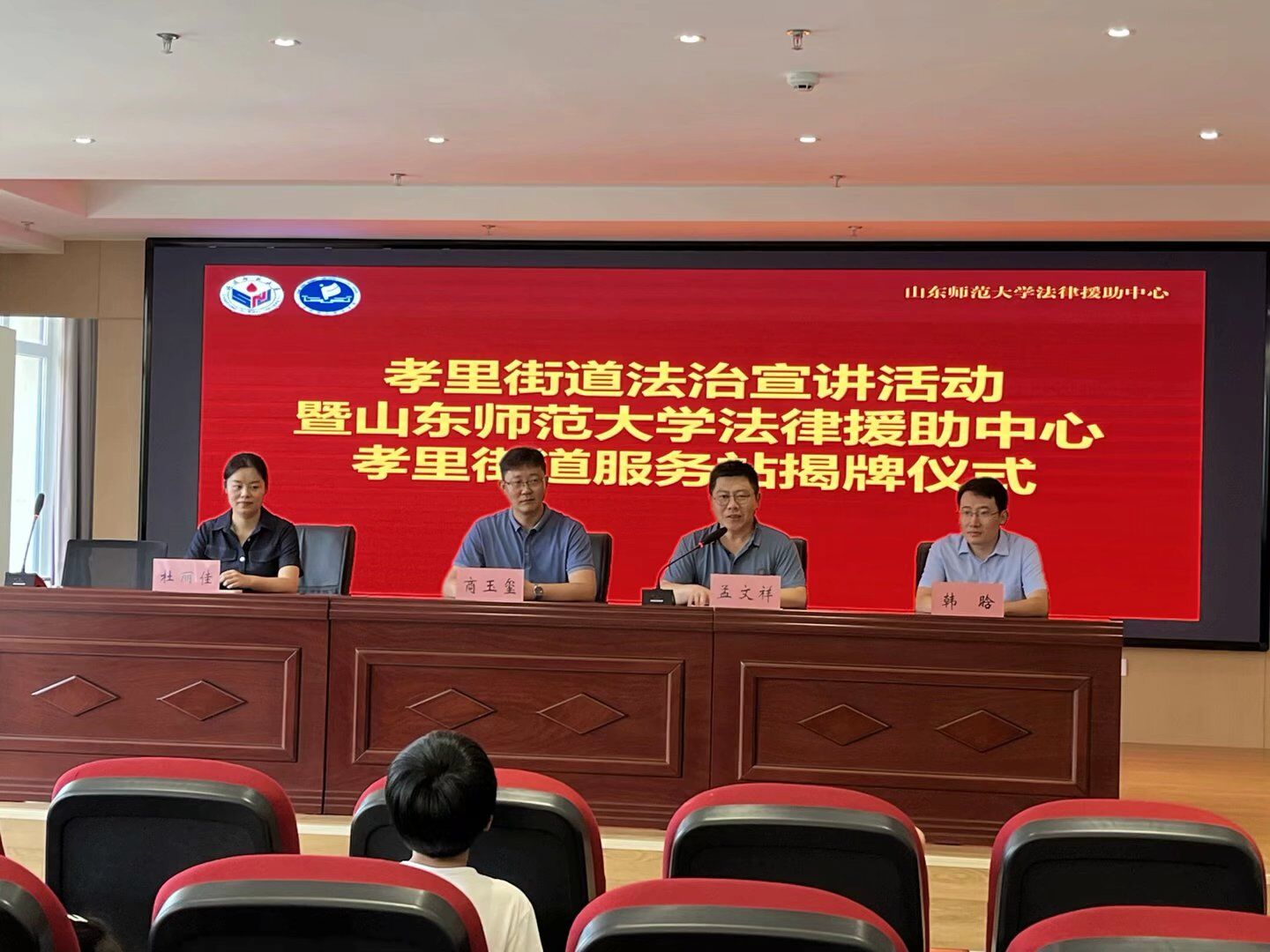 仪式上,孟文祥致欢迎辞,祝贺山东师范大学法律援助中心孝里街道服务站正式成立,并为实践服务队介绍了孝里街道的地区历史文化和“红色孝里”的革命精神。他表示孝里街道将以此为契机,借助法学院优质教育资源和研究成果,强化依法治理、依法办事,为街道法治建设注入新的活力。商玉玺表示法律援助中心将与孝里街道保持长期联络、深化合作交流,将法律援助和关爱青少年儿童的志愿服务活动常态化、长效化,持续宣传法律知识,传递爱心与能量。孟文祥、商玉玺共同为山东师范大学法律援助中心孝里街道服务站揭牌。