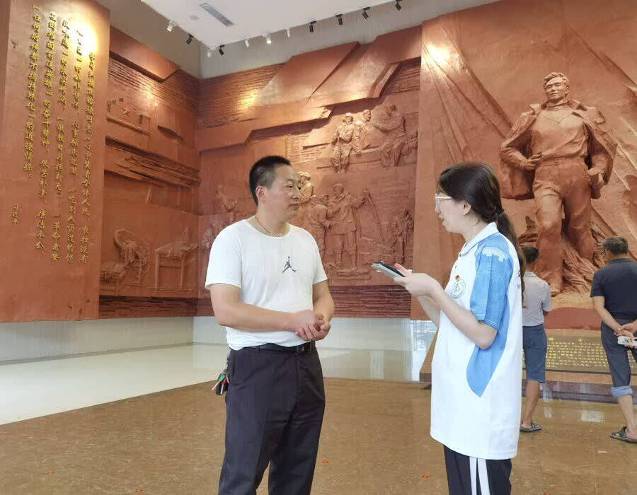 图为实践队员在采访焦裕禄纪念园工作队员 通讯员 刘玉雄 摄