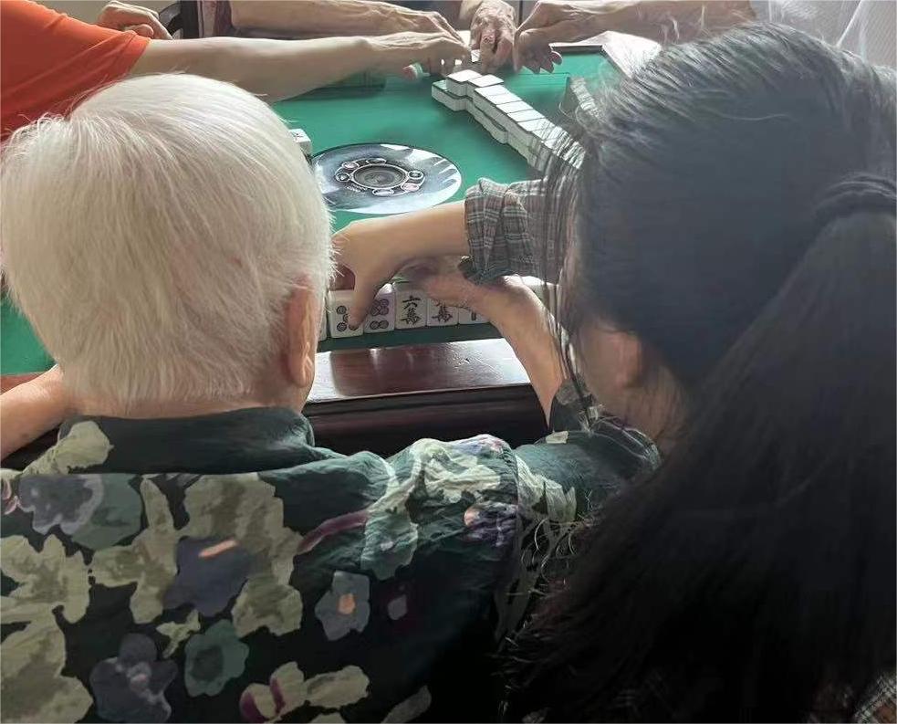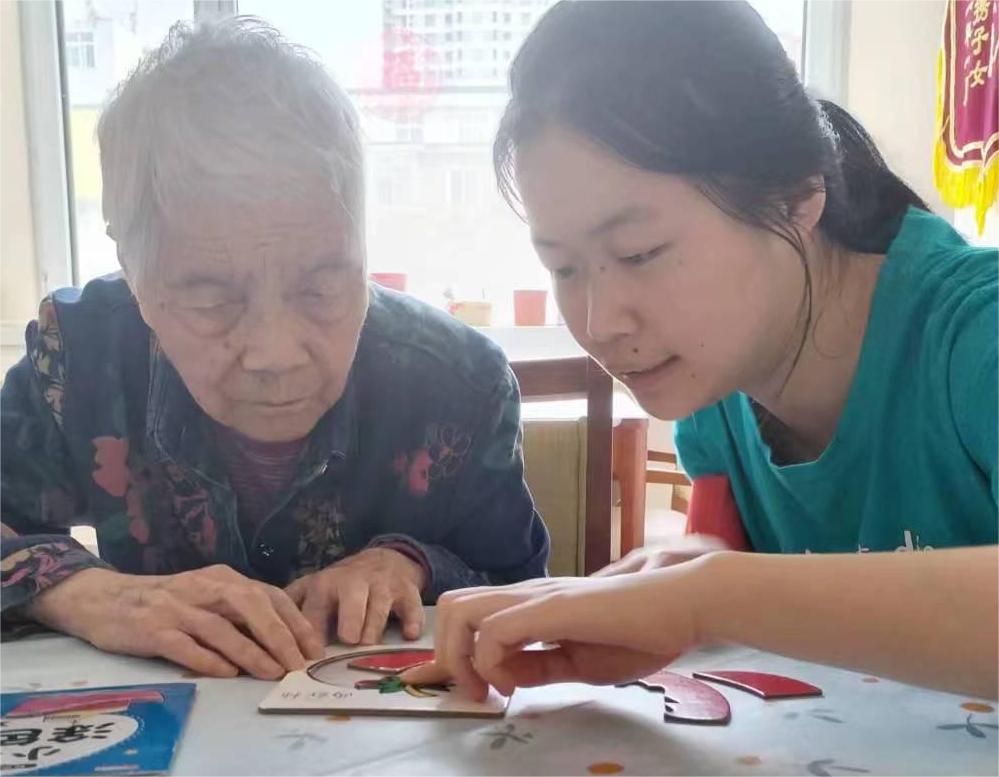 我们“柠月”社会实践团队的成员在和养护院的爷爷奶奶们做完游戏后,又跟那些没有参与游戏的老人们进行了一些交流,虽然大部分是奶奶问我们一些问题,但这也促进了我们与老人之间的关系,在交谈的过程中我们也了解到爷爷奶奶们的生活,走进了他们的内心世界,使我们小组成员更加理解了养护院存在的意义,并且也感受到虽然他们年纪大了,不过他们所拥有的人生经历还是我们需要采纳的。为了适度锻炼这些奶奶们的反应能力,养护院提供了一些简单的拼图,我们在一旁边聊天边和奶奶们一起拼图,给她们适当的提示,让她们也有游戏体验感。在首慈·乐康养护院,我们实践小组的成员也看到了服务人员和老人之间良好的关系,他们敬老、爱老、尊老、护老,如同一个大家庭,真实的关心每一个老人,真正落实了习近平总书记对老龄工作的指示;对于我们这些实践小组的成员,接待我们的姐姐也十分用心,让我们感受到属于这个大家庭的温暖。