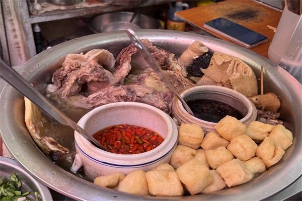 老板柜台上有两个大锅,一个锅煮的就是牛腩,牛杂,豆腐炸。在汤中还放有两个不同口味的调味香油煲盅,一个装的是辣味的香油,另一个装的是不辣的香油。另一个锅里放的是带有些许增味的汤水,主要用来煮河粉。