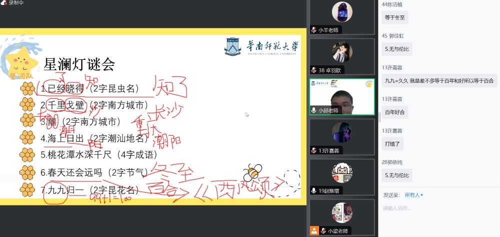 第二门课程《灯谜课》于上午9:30拉开序幕。邱莎鑫老师首先给同学们简要介绍了灯谜的结构、注意事项和模式等基础知识,为同学们理解灯谜的规则和背后的文化内涵打下坚实基础。