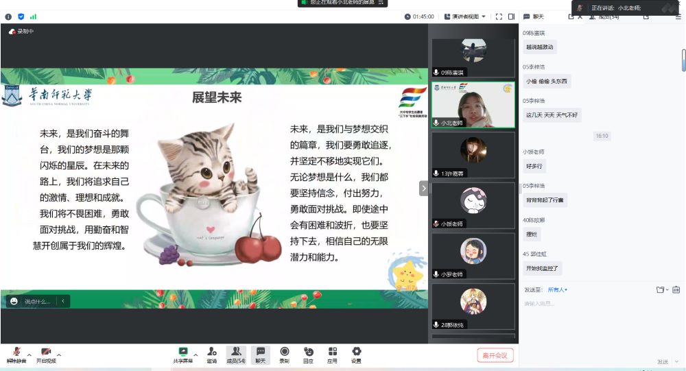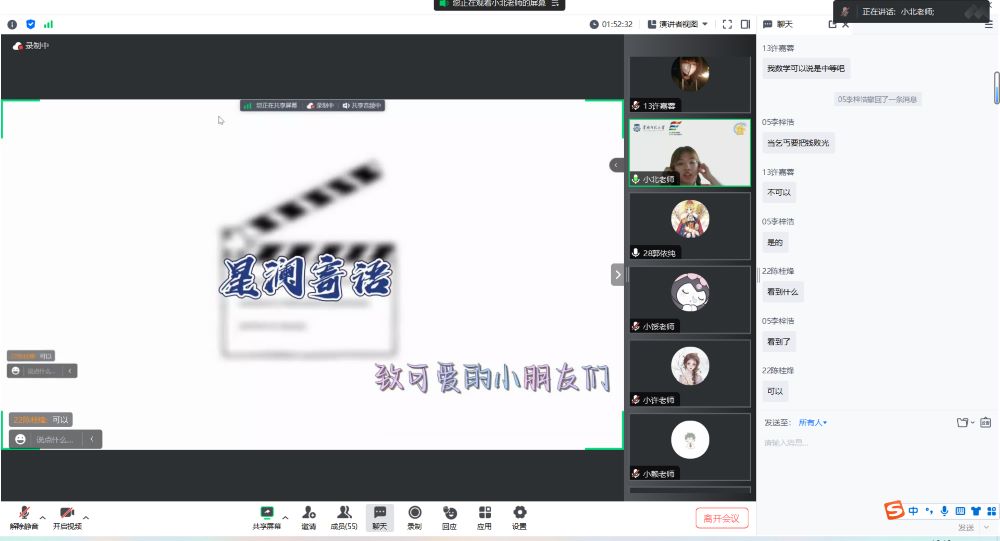紧接着,班主任准备了emoji猜成语、加字游戏以及断句挑战三个游戏让小朋友们和小老师们一起互动,而这次的游戏互动与破冰班会时截然不同,同学们竞相开麦、热情互动,已然褪去了第一次见面时的陌生和拘束,充分展现了夏令营七天共同成长的显著成果。随后班主任引导小朋友们思考未来的发展方向和目标 ,并且分享了自己的相关经历,激励学生制定计划去追求理想。